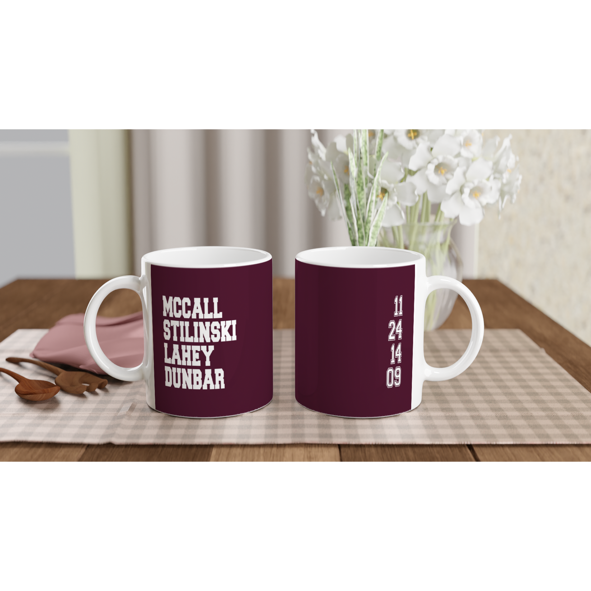 Un mug avec les noms de MCCALL - 11 & STILINKSI - 24 & LAHEY - 14 & DUNBAR - 09 des personnages Scott McCall, Stiles Stilinski, Isaac Lahey et Liam Dunbar, joués respectivement par Tyler Posey, Dylan O'Brien, Daniel Sharman et Dylan Sprayberry dans la série Teen Wolf. Ce produit est dérivé de la convention BEACON HILLS FOREVER, elle-même inspirée de la série Teen Wolf.